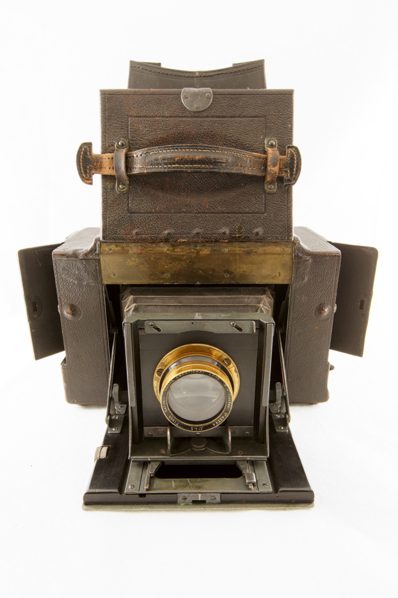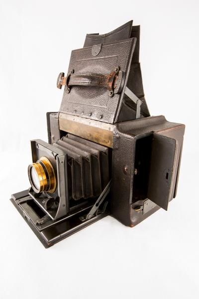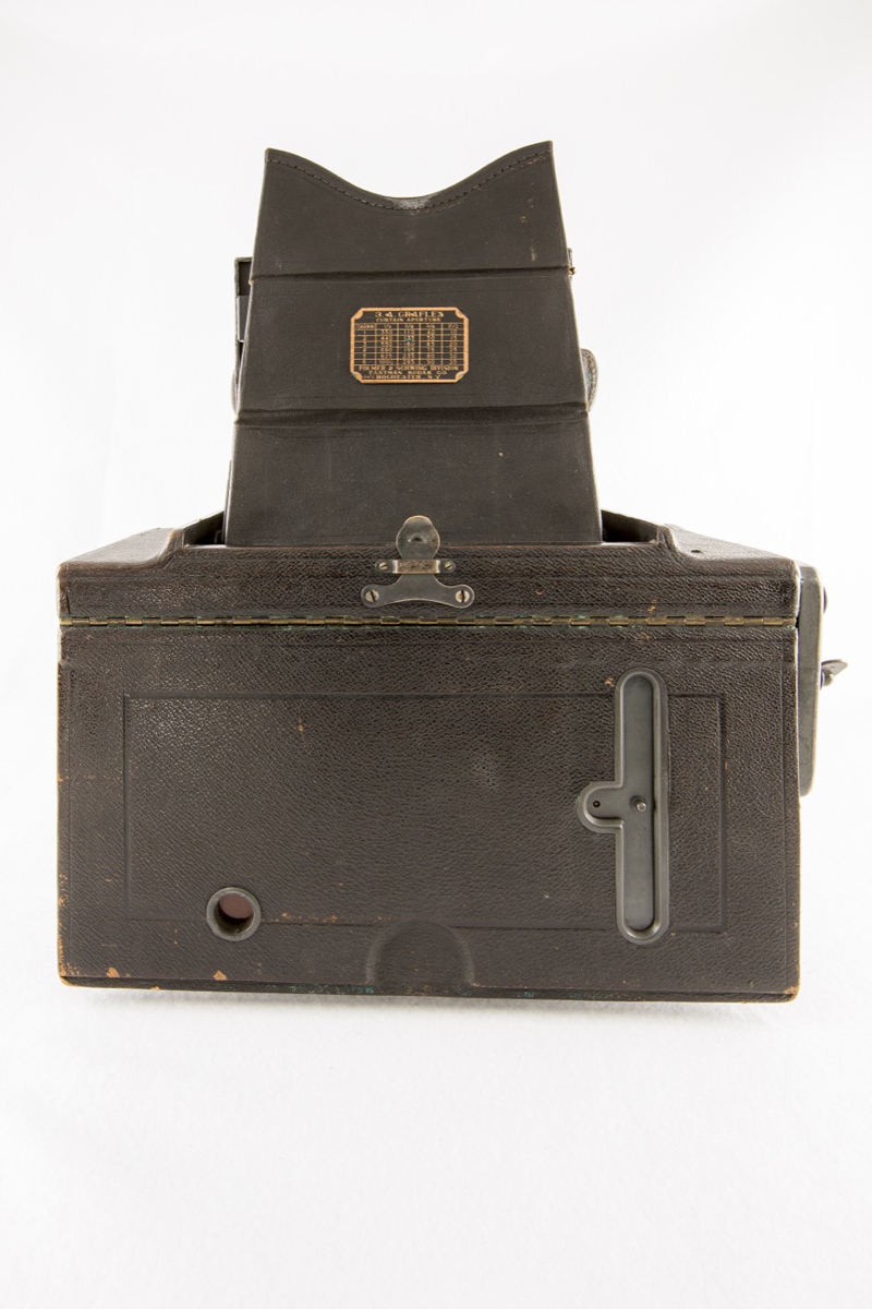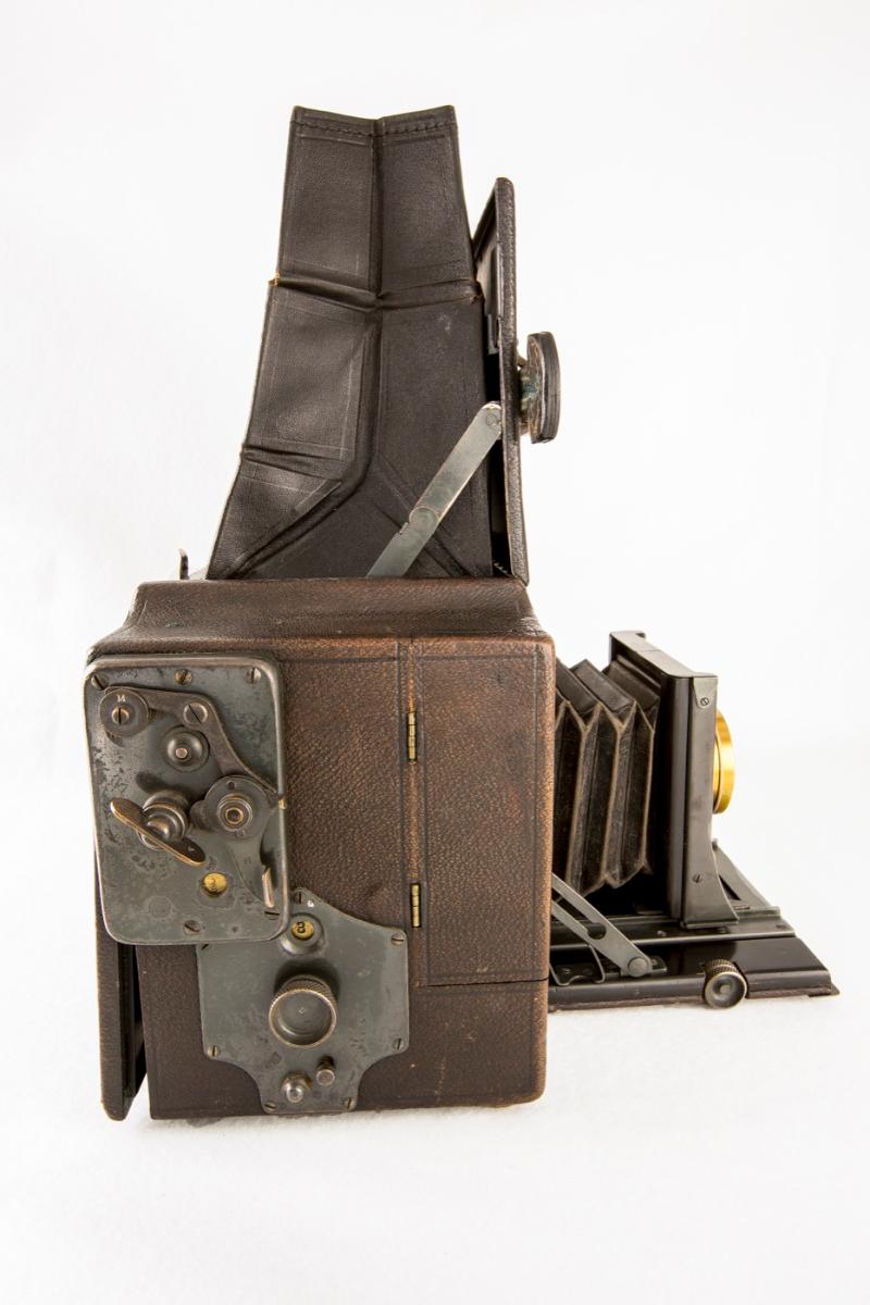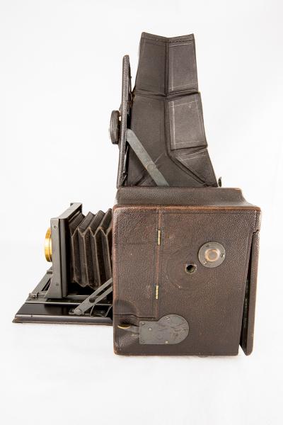 A large boxy SLR camera with a top fold-up viewing hood. Camera is covered in dark brown leather with a wooden frame. Brass lens/shutter combination. Autographic window feature is available on the rear of the camera body. Storage doors on both sides of the camera. The viewfinder has a brass plate that identifies the camera name, maker, and model number.Credit Line