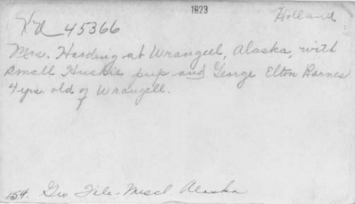 [Title not known]D. L. HollandyKeystone View CompanyObject Number1996.0009.KU45366Date1923PlaceNorth and Central America - United States - Alaska - Wrangell-Petersburg - WrangellDimensions4 3/16 x 7 3/16 in. (10.6 x 18.2 cm)InscriptionsMrs. Harding at Wrangell, Alaska, with small husky pup and George Elton Barnes 4 yrs. old of Wrangell.ClassificationGelatin silver printsCredit LineKeystone-Mast Collection, UCR/California Museum of Photography, University of California, RiversideShow more