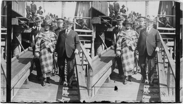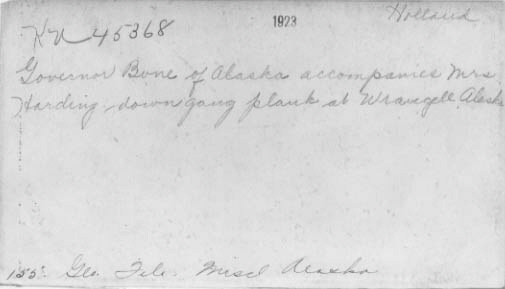 [Title not known]D. L. HollandyKeystone View CompanyObject Number1996.0009.KU45368Date1923PlaceNorth and Central America - United States - Alaska - Wrangell-Petersburg - WrangellDimensions4 3/16 x 7 3/16 in. (10.6 x 18.2 cm)InscriptionsGovernor Bone of Alaska Accompanies Mrs. Harding Down Gang Plank at Wrangell, Alaska.ClassificationGelatin silver printsCredit LineKeystone-Mast Collection, UCR/California Museum of Photography, University of California, RiversideShow more